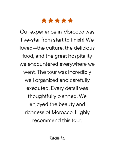 Every day of our journey is intentionally designed to awaken a different part of you. From wandering through the colorful medinas of Fes to finding stillness in the vast Sahara dunes, our itinerary blends adventure, reflection, and connection. We’ll share tea with nomadic families, explore ancient cities, and watch the sun rise over the desert—moments that invite you to slow down, breathe deeply, and see the world (and yourself) with new eyes. Each stop, meal, and shared laugh is part of a bigger story—one that reminds you how full life can feel when you move with purpose.
